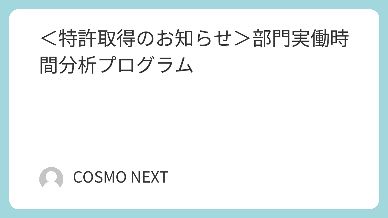 <特許取得のお知らせ>部門実働時間分析プログラム 特許・商標出願 2024.11.07 この度、下記の特許を取得しました。特許番号:特許第7576818号発明の名称:部門実働時間分析プログラムこれにより、部門ごとの実働時間が容易にわかるようになります。