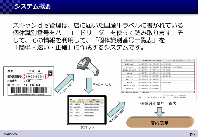 手書き・Excelの手入力はもう卒業。ラベルをスキャンするだけで、焼肉店掲示用の国産牛個体識別番号一覧表を自動生成。